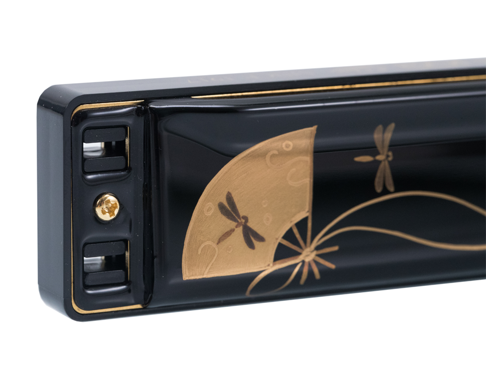 TOMBO 100周年紀(jì)念款10孔口琴,采用天然樹(shù)脂涂料以及日本傳統(tǒng)的本漆蒔繪工藝。本琴以金、銀屑加入漆中,干后做推光處理,顯出金銀色澤,極盡華貴,這就是日本傳統(tǒng)的蒔繪工藝,產(chǎn)于奈良時(shí)代。同時(shí)每一支口琴都是日本著名的手繪大師—中村光彩手繪而成,并在全球做限量發(fā)行。黑色烤漆的是C調(diào),紅色烤漆的是A調(diào)可供選擇,加厚的音簧座板上采用的鍍金工藝。同NO.1710超特級(jí)的一樣的琴體,在此基礎(chǔ)上又做了更加精細(xì)的調(diào)音,除了當(dāng)做收藏品外,作為樂(lè)器也可以演奏獨(dú)一無(wú)二的特音色。獨(dú)創(chuàng)的梧桐木琴盒防潮抗摔利于收藏。
