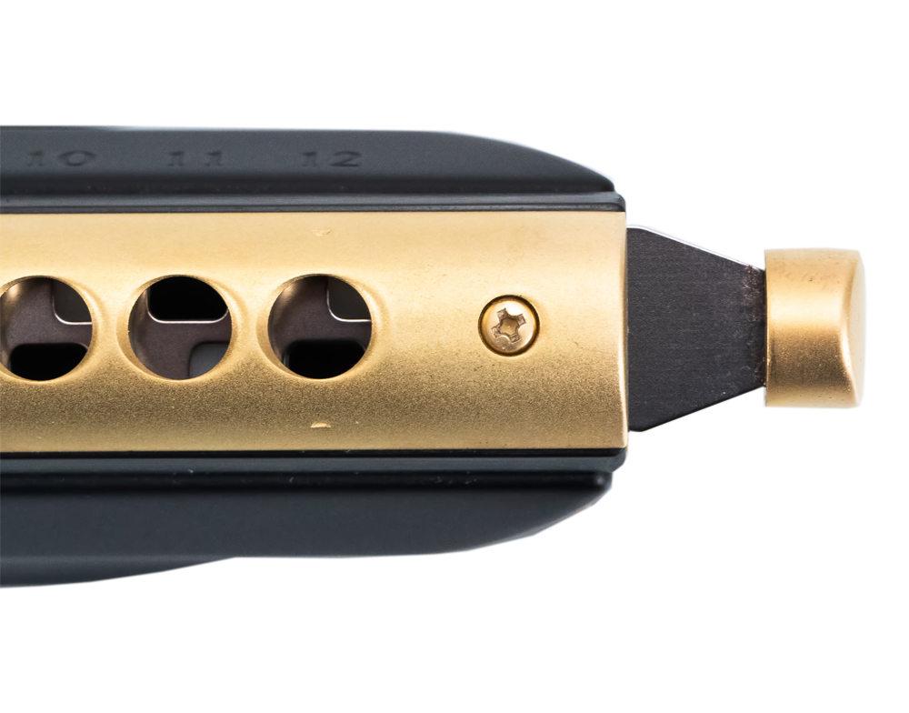 吹口采用的磨砂鍍金工藝,演奏時(shí)即便嘴唇干燥也不會(huì)產(chǎn)生不舒適的感覺(jué)。另外,吹口有音階標(biāo)示,嘴唇能感覺(jué)到,演奏時(shí)會(huì)很安心。蓋板整體采用黃銅黑色啞光噴涂。音簧膜片的材料和形狀通過(guò)各種試制之后,精選最優(yōu)質(zhì)的音簧膜片設(shè)計(jì),音色更加完美獨(dú)特。音簧采用獨(dú)創(chuàng)的加厚材料(形狀是根部厚,頂尖處薄的形狀),加上通寶獨(dú)特的柔和音色,這款口琴很重視從低音到高音的平衡均勻度。此款產(chǎn)品在演奏時(shí)能夠感到很順暢,新設(shè)計(jì)的膠片能夠確保高效的演奏效果。